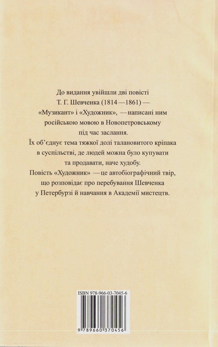 В конце 1854 и начале 1855 г. Т.Г.Шевченко пишет повесть "Музыкант" по оригинальному сюжету. Произведение посвящено крепостной интеллигенции. "Художник" - автобиографическая повесть Тараса Шевченко написанная на русском языке 25 января (4 октября) 1856 года. Автор продолжает разрабатывать тематику судьбы талантливого крепостного, начатую им в повестях «Варнак» и «Музыкант».