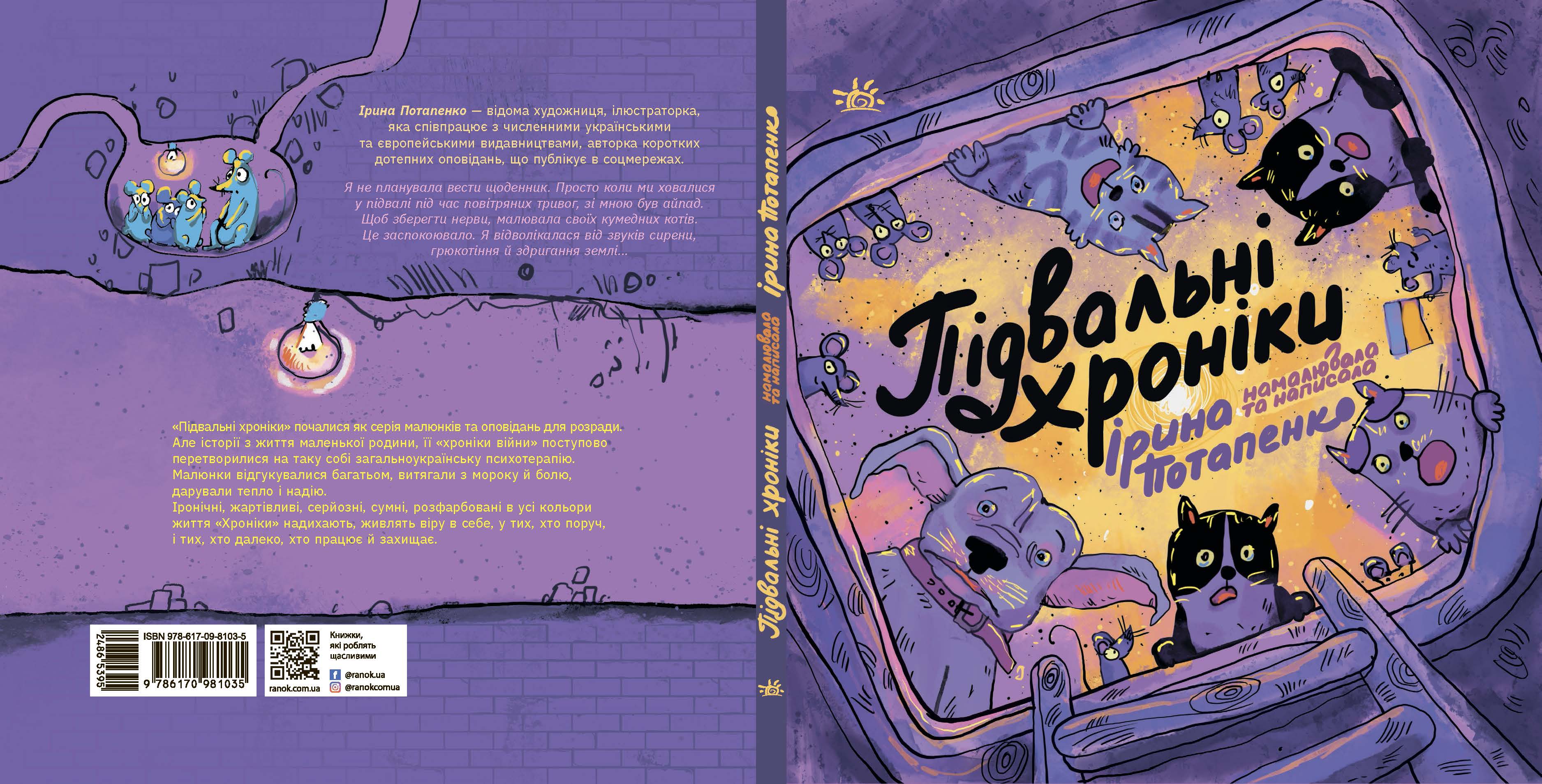 Збірка творів відомої художниці Ірини Потапенко розпочалася з кількох малюнків і коротеньких текстів, що поступово перетворилися на справжній щоденник війни. «Підвальні хроніки» — це дотепні, жартівливі й сумні, іронічні та мрійливі історії про життя родини з двох людей і п’ятьох хатніх тварин під виття сирен і гуркіт вибухів. Ці тексти відгукувалися багатьом, втамовували біль, дарували маленькі радощі, живили надією і надихали в найтемніші й найстрашніші ночі, підтримуючи віру в перемогу.