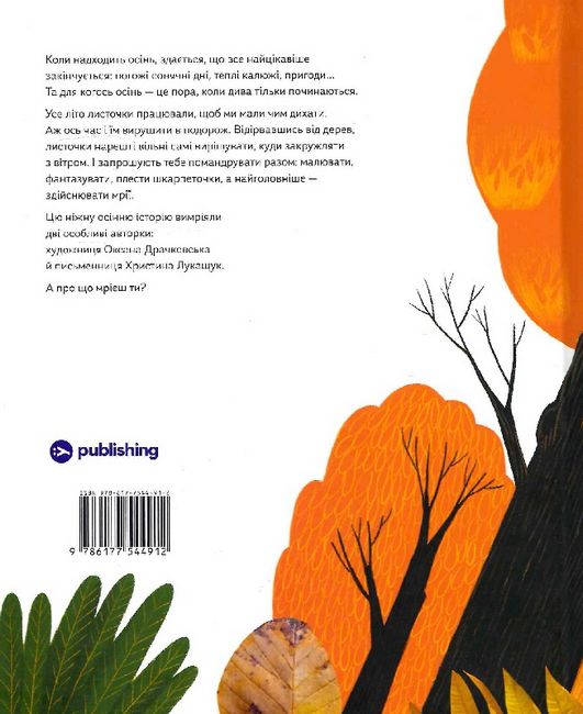 «Про що мріють листочки» — це зворушлива інтерактивна книжка для маленьких читачів. Вона створена українською авторкою Христиною Лукащук на основі серії ілюстрацій Оксани Драчковської, які в 2021 році увійшли до списку фіналістів Болонської виставки ілюстраторів. На сторінках книжки «Про що мріють листочки» читачі познайомляться з паном Листочком та його побратимами й вирушить з ними в найзаповітнішу подорож. Восени листочки покидають свої домівки й опадають. Та це не привід сумувати — адже тільки так вони можуть здійснити мрії, пережити фантастичні пригоди й дізнаватися на що здатні. Долучитися до здійснення мрій листочків у книжці можуть і читачі, наприклад, домалювавши вбрання чи вигадавши подальші пригоди котрогось із героїв.