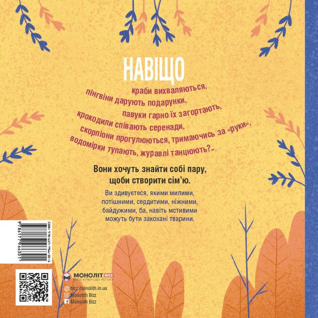 Тварини для нас часто незрозумілі та привабливі, особливо коли ми бачимо те, що неможливо пояснити тільки інстинктами і природою. Як же звірі, птахи, комахи і навіть риби знаходять собі пару? У цій книзі вас чекають дивовижні історії про те, як тварини закохуються, створюють сім'ї і ростять своїх дитинчат.
