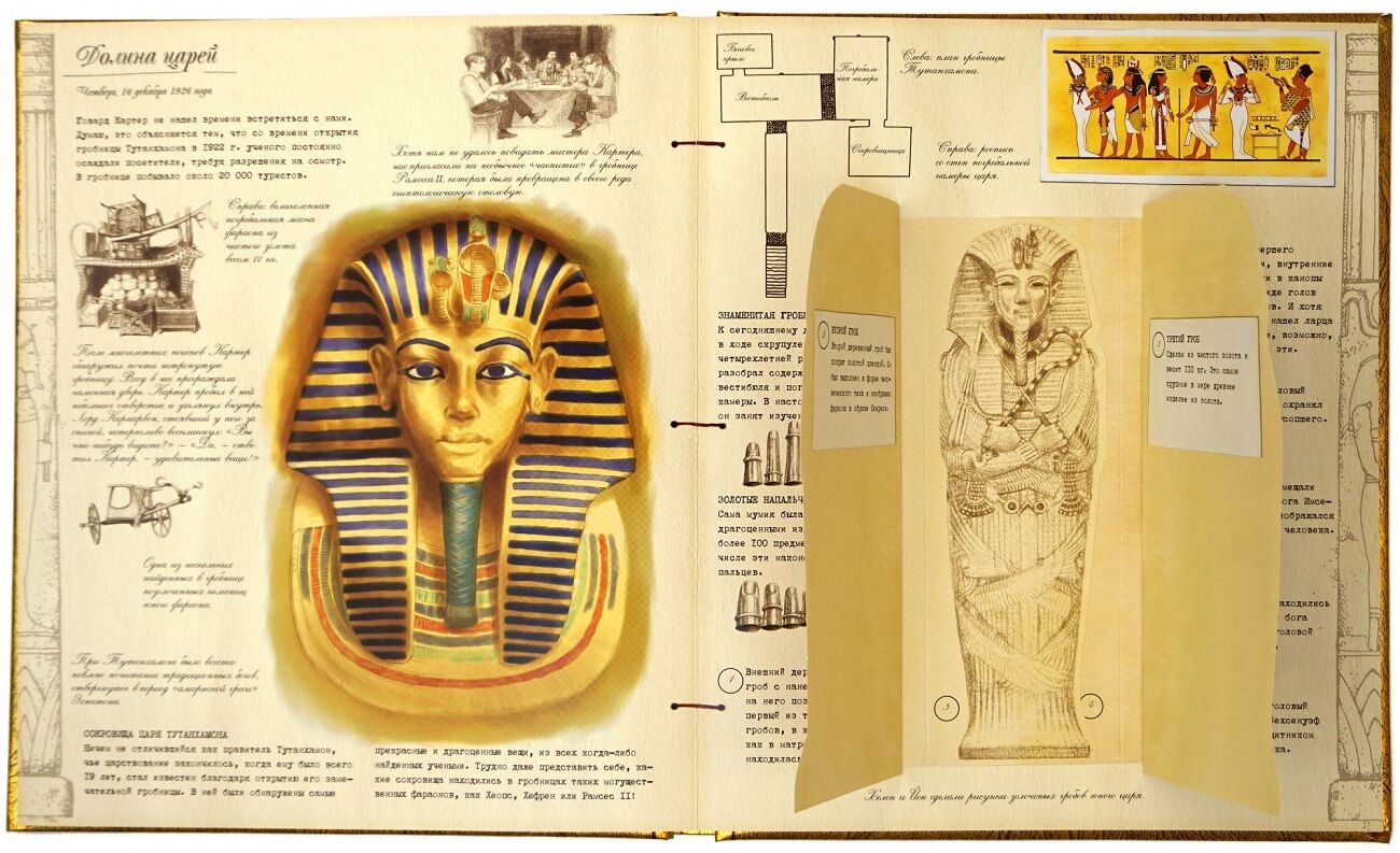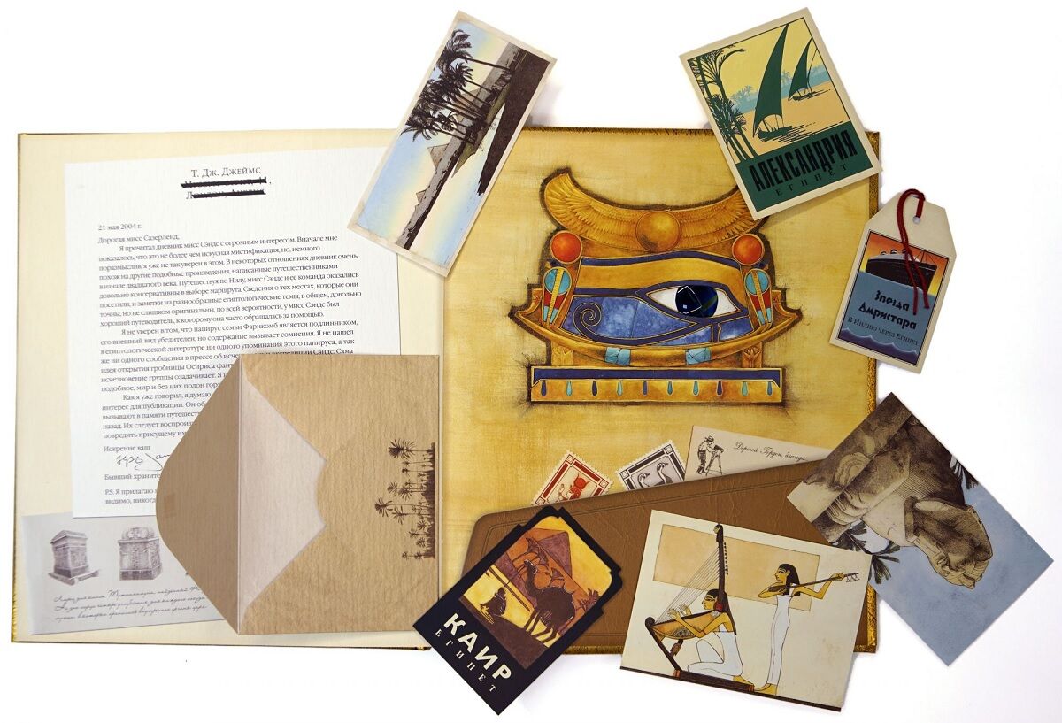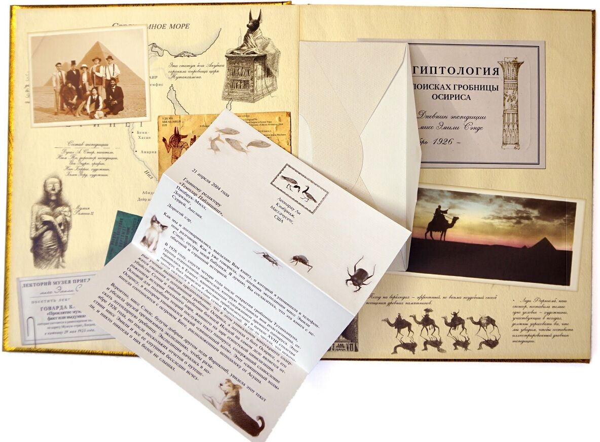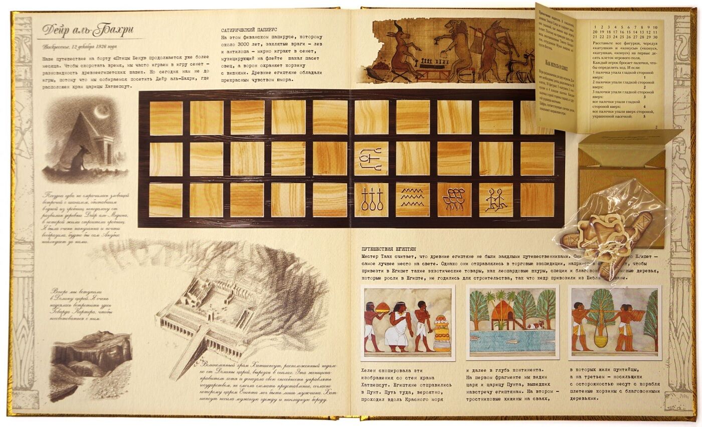 Каждая книга это не только увлекательное содержание, но и дополнительные материалы в виде красочных карт, невероятных мини-книжек, образца пелены мумии, схема пирамид, магическим глазом сфинкса, писем из Египта с открытками, фотографиями и даже багажным талоном. Обложка книги инкрустирована волшебными камнями. Книга также содержит древнюю египетскую игру с древними игровыми фишками и волшебным игровым полем.