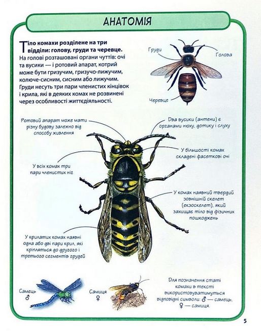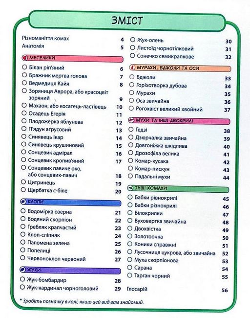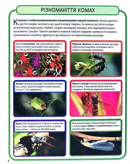На сторінках енциклопедії ви знайдете інформацію про метеликів, мурашок, коників, жуків та інших 50 видів комах. Дізнаєтесь про їхнє середовище та про їхні ознаки.