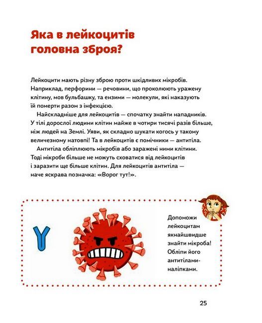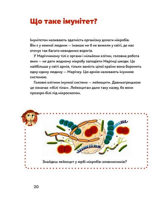 Разом з допитливою Марічкою і її кошеням ти опинишся у справжній лабораторії, де зможеш роздивитися мікробів під мікроскопом і побачити, як саме наше тіло дає їм відсіч. Ти побуваєш на заводі, де виготовляють вакцини, і познайомишся зі вченими, які їх розробляють. А наприкінці книжки зможеш допомогти героям створити власну вакцину проти досі невідомих інфекцій. У книжці на тебе чекає купа інтерактивних завдань, ігри та наліпки! Та пам’ятай — мікробам про неї анічичирк!Книжка детально і просто пояснює, як організм захищає нас від інфекцій, а також розказує про історію винайдення та принцип роботи вакцин. Окрім того, книжка містить корисні поради, як підготуватись до щеплення і не боятись уколів; як не втрапити на гачок антивакцинаторів і як дізнатися, коли робити щеплення. Вона допоможе читачам будь-якого віку зрозуміти, як працюють імунітет і вакцини.