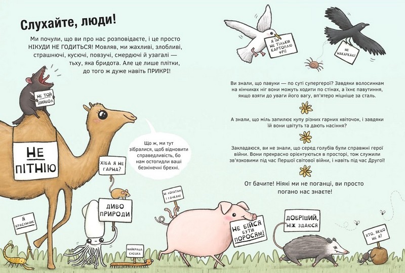 У всіх нас є певна істота, від якої наша шкіра каракуляє і робить «хібі-джибі». Павуки, від яких ми кричимо, миші, які змушують нас стрибати на меблі, або кажани, від яких ми здригаємося. У всьому світі є істоти, великі й малі, які змушують нас шаленіти від однієї лише думки про них. Але що зробили ці тварини для такої поганої репутації? Здебільшого саме люди називають їх потворними, небезпечними та відверто огидними. Але насправді ці малюки не заслуговують такого ставлення. Ця книга створена для того, щоб розвіяти ці фальшиві міфи раз і назавжди! Смішними ілюстраціями та цікавими фактами вона допоможе дітям розкрити правду про цих тварин і дізнатися все про те, яку важливу роль відіграє у світі кожна істота. Це видання — приємне та кумедне знайомство з понад 30 тваринами, великими та малими, які насправді зовсім не такі вже й погані!