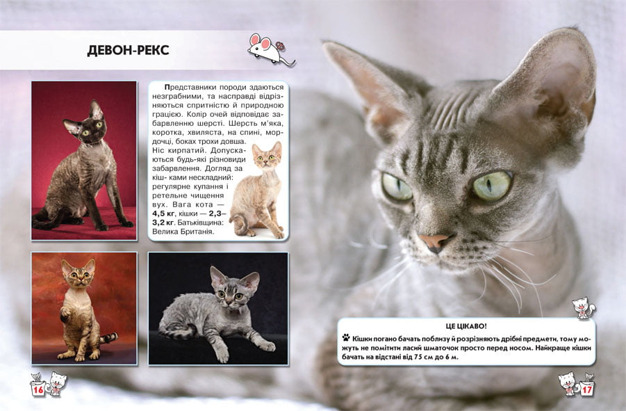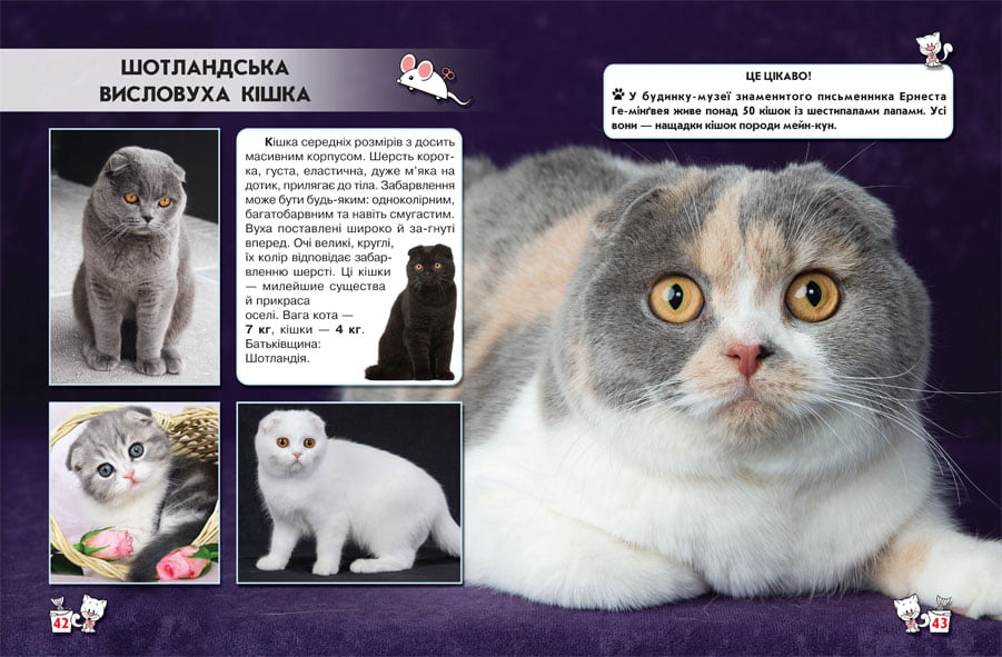 А розміщені в книжці яскраві фотоілюстрації допоможуть скласти уявлення про зовнішній вигляд і вдачу вусатих мурчиків.