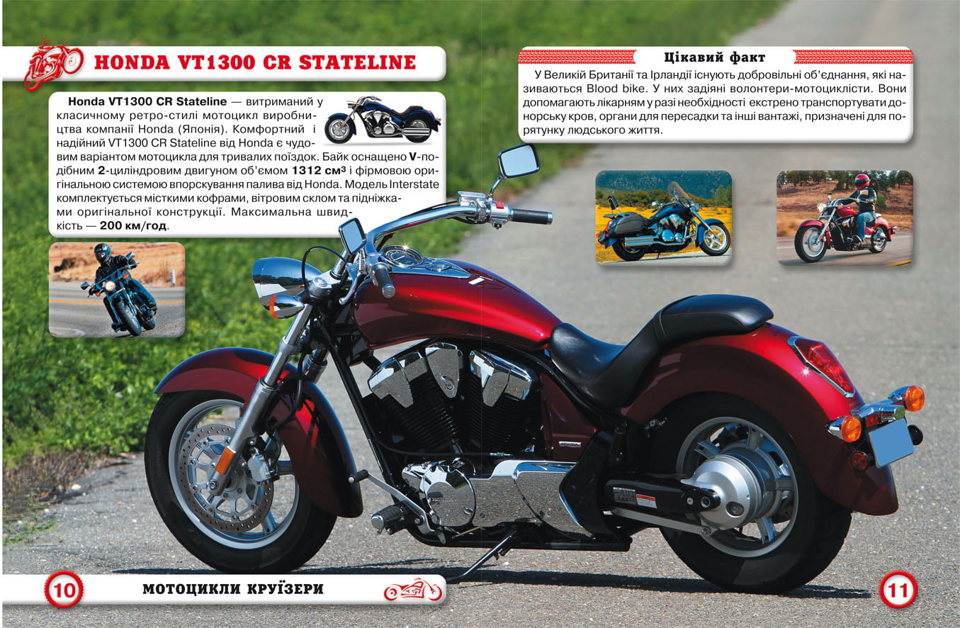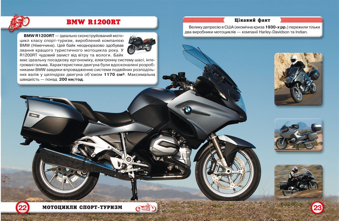Сьогодні існує багато різновидів «залізних коней», основні з яких представлено в цій книжці. Крім технічних характеристик мотоциклів, ви знайдете тут інформацію стосовно їхніх чотириколісних побратимів — квадроциклів. Розміщені на сторінках видання яскраві фотографії продемонструють особливості дизайну кожної моделі й покажуть мотоцикли в динаміці.