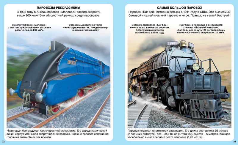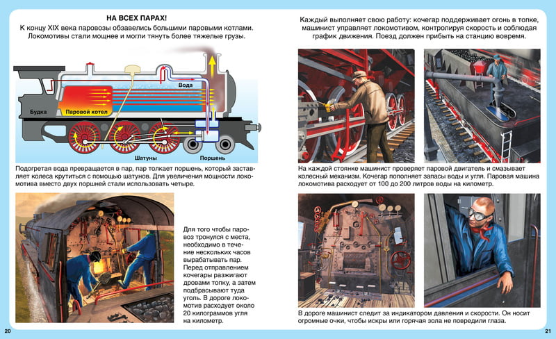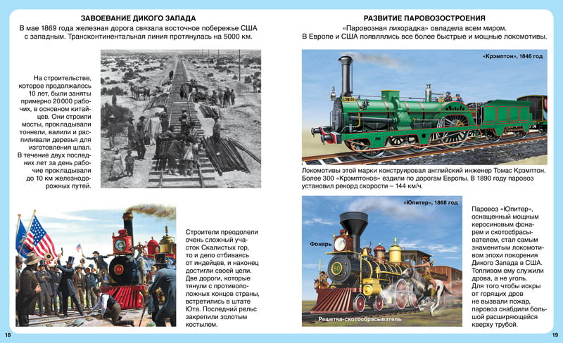 Эта книга откроет перед вами увлекательную 200-летнюю историю железных дорог. Юные читатели узнают, как железные дороги зменили жизнь людей, как был устроен паровоз и чего боялись его первые пассажиры, как менялись локомотивы, вагоны и вокзалы, побывают в вагонах и купе легендарных составов. На великолепных иллюстрациях представлены и первые паровозы, и высокоскоростные поезда будущего.