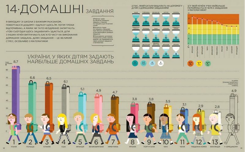 Складно повірити, але подекуди діти впрівають над домашніми завданнями навіть більше, ніж в Україні. З цією книжкою Ваша дитина потрапить на шкільний обід у різних державах, дізнається, яку шкільну форму носять у Нігерії та Ірані.