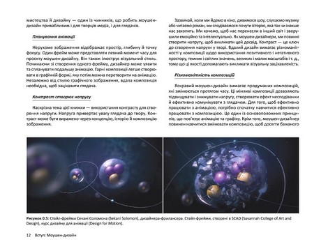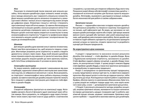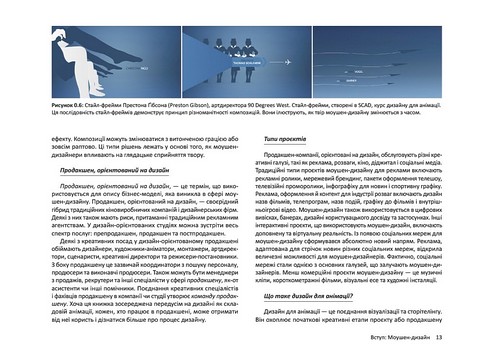 Книжка «Дизайн для анімації: Основи та техніки моушен-дизайну», завдяки поєднанню принципів мистецтва та дизайну з креативним сторітелінгом і професійними знаннями, охоплює все, чого потребує справжній моушен-дизайнер, аби втілювати власні художні задуми в реальність і впевнено виконувати замовлення клієнтів.