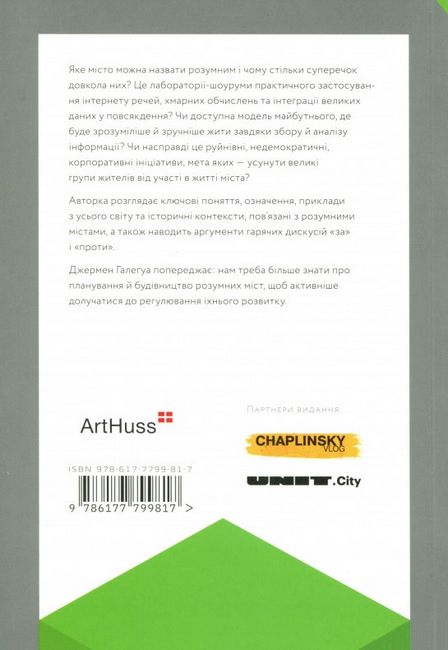 Авторка розглядає ключові поняття, означення, приклади з усього світу та історичні контексти, пов’язані з розумними містами, а також наводить аргументи гарячих дискусій «за» і «проти».