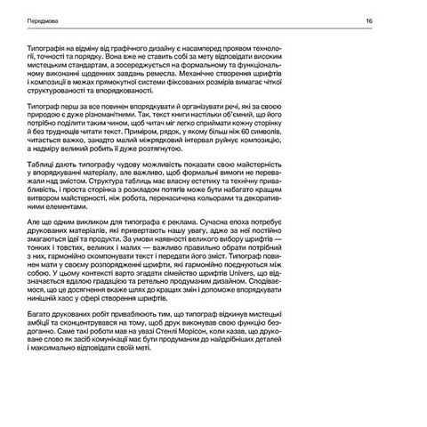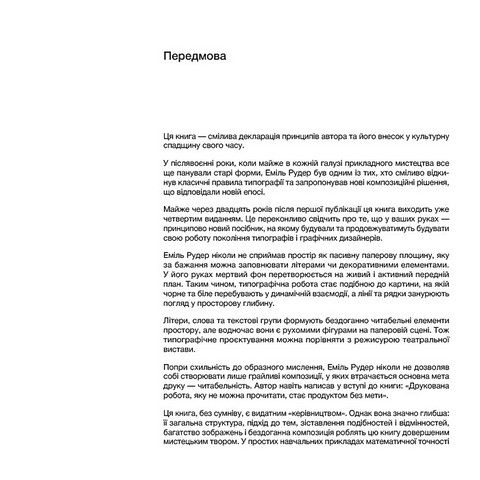 Книга «Типографія» є спадщиною Еміля Рудера, одного із засновників швейцарського стилю в дизайні, відомого в усьому світі за використання асиметричної верстки, модульної сітки, шрифтів без засічок, вирівнювання по лівому краю та порожнього простору на сторінці.