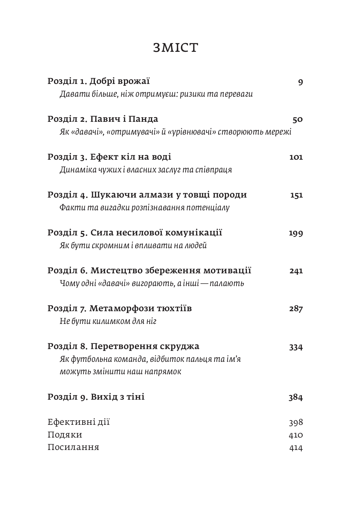 Вона містить практичні кейси еволюції альтруїстів бізнесового, корпоративного, кар’єрного та особистісного рівня, розібрані з академічною ретельністю та викладені в легкому, дотепному та щирому тексті беззаперечно успішного альтруїста Адама.