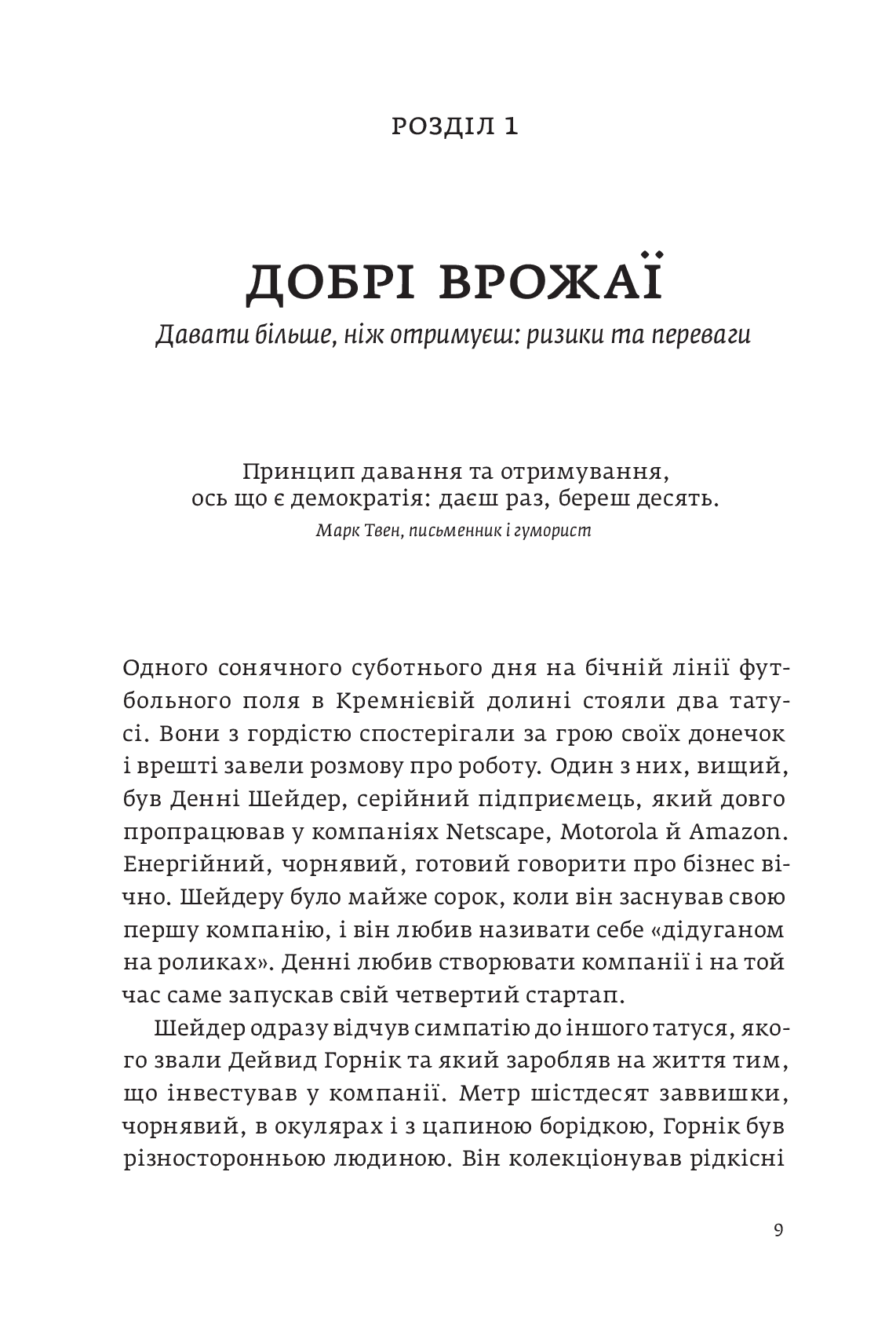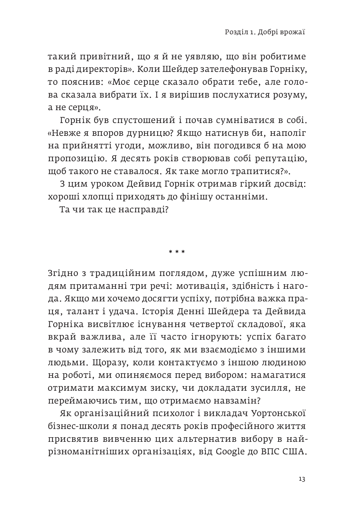 Доктор психології Адам Ґрант, професор Уортонської школи бізнесу, дає глибоко вмотивовану й неочікувану відповідь на утопічне питання: «Чи можливо досягти суттєвого успіху, допомагаючи іншим на шляху до нього».