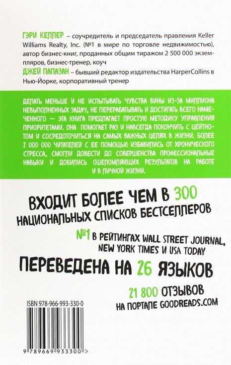 В основе предлагаемой в ней методики лежит простой принцип — на каждом временном отрезке, в каждом проекте, в каждой из жизненных сфер, нужно сосредоточить свое внимание ТОЛЬКО НА ОДНОЙ ЗАДАЧЕ. На первый взгляд, этот подход кажется утопией, но если проанализировать истории по-настоящему успешных или даже выдающихся людей, станет ясно: все они действовали точно так же — фокусировали внимание на одной вещи и добивались феноменальных результатов. Автор "Начни с главного!" — Гери Келлер, владелец крупнейшего в Америке холдинга по торговле недвижимостью — подробно рассказывает, как следуя этому принципу, не выпустить из-под контроля остальные процессы и поднять свою продуктивность до нечеловеческих высот.