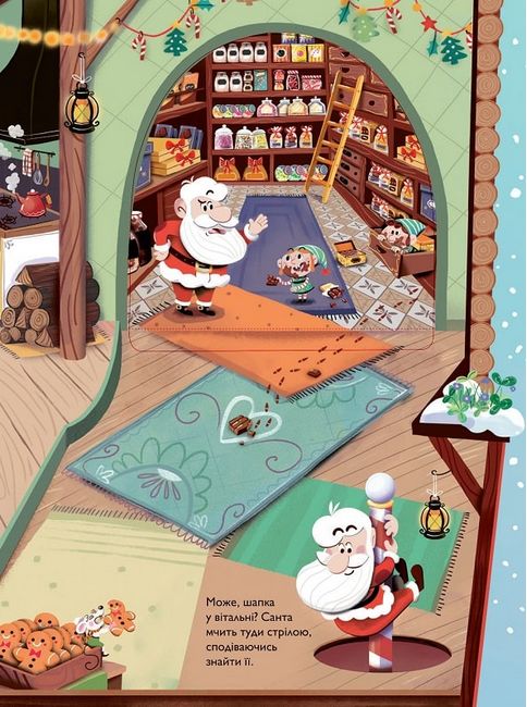 Чудова книжка з віконцями, за якими ховаються сюрпризи будинку Санти.Гайда разом із ним шукати шапку!
