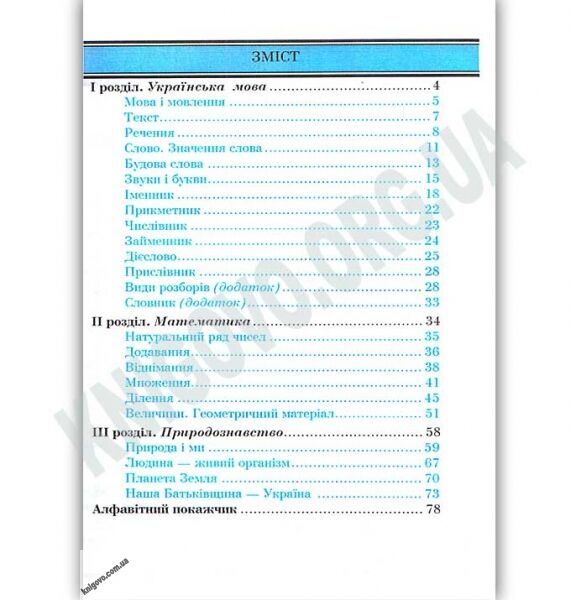 Мета довiдника — сприяти узагальненню знань учнiв початкових класiв з української мови, математики та природознавства, а також систематизувати загальнонавчальні навички i вмiння учнiв. Зміст, об’єм та послiдовнiсть викладу матерiалу довiдника вiдповiдають оновленій програмi початкових класів. У першому розділi вмiщено короткi вiдомостi про мову i мовлення, текст, речення, слово та подано правописний коментар частин мови. У додатку наведено зразки граматичних розборiв та подано слова, правопис яких необхiдно запам’ятати. В другому розділі вмiщено основнi вiдомостi про натуральний ряд чисел, дiї додавання, вiднiмання, множення, дiлення та їх застосування. Наведено основний геометричний матерiал і таблицi величин. У третьому розділі подано пояснення основних понять курсу Природознавство в початкових класах, вміщено таблиці властивостей корисних копалин, характерних особливостей природних зон України тощо. У довiднику видiлено не тiльки основнi граматичнi правила, математичнi поняття, але й наведено типовi приклади i зразки виконання практичних завдань. Довiдник призначений для учнiв початкових класiв, учителiв, батьків, вихователів груп продовженого дня.