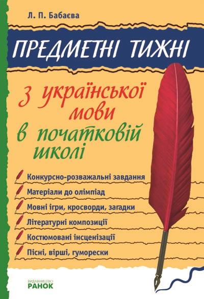 Предметні тижні з української мови в початковій школі 1-4 класи Бабаєва Л. Ранок. Пропонований посібник допоможе організувати Тижні української мови в 1–4 класах. У ньому вміщені матеріали для олімпіад по класах, мовні ігри, конкурси, вікторини, лабіринти, кросворди, вірші, гуморески, пісні, інсценізації. І все це об’єднано в єдиний сценарій свята української мови, яке триває п’ять днів поспіль.