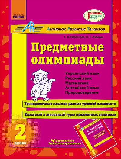 Предметные олимпиады 2 класс Меренцова О. АРТ Ранок. Пособие (автор Меренцова Е. В., Муренець О. Г.) предназначено для подготовки младших школьников к предметным олимпиадам. Оно содержит тренировочные задания по предметам «Украинский язык», «Русский язык», «Математика», «Английский язык», «Природоведение». Работать с ним могут ученики с разным уровнем знаний, т. к. задания подобраны по принципу «от простого к сложному».