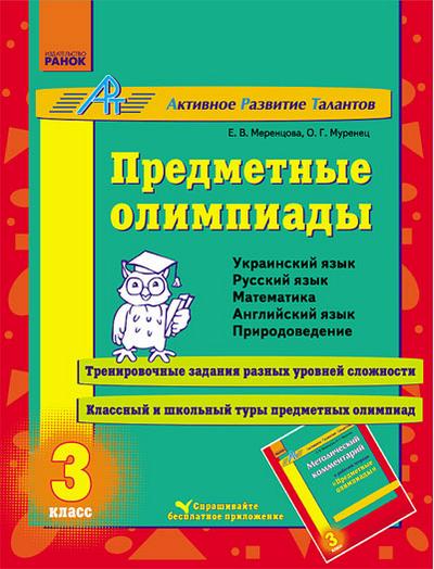 Предметные олимпиады 3 класс Меренцова О. АРТ Ранок. Пособие (автор Меренцова Е. В., Муренець О. Г.) предназначено для подготовки младших школьников к предметным олимпиадам. Оно содержит тренировочные задания по предметам «Украинский язык», «Русский язык», «Математика», «Английский язык», «Природоведение».
