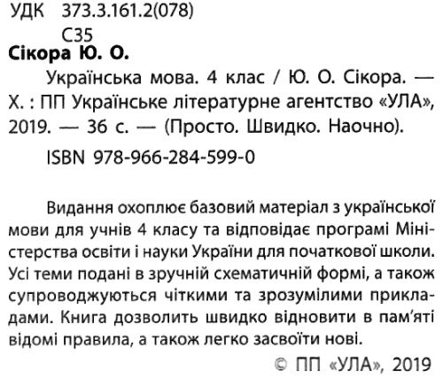 Українська мова 4 клас Просто Швидко Наочно Усі правила Сікора Ю. Вид: УЛА