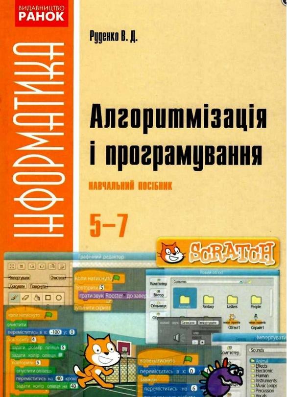 Інформатика SCRATCH Алгоритмізація і програмування Навчальний посібник 5-7 клас Руденко В. Ранок. Посібник призначений для учнів 5-7 класів загальноосвітніх навчальних закладів, учителів інформатики.