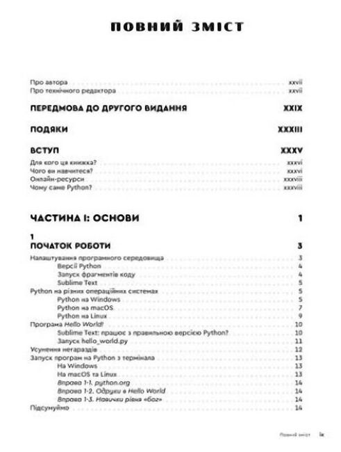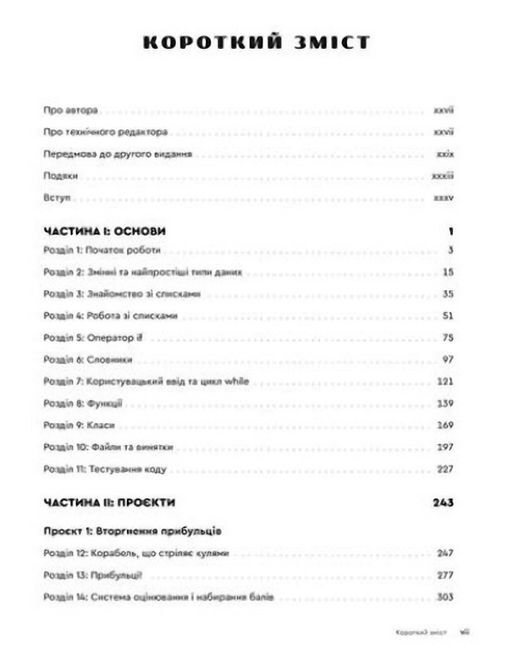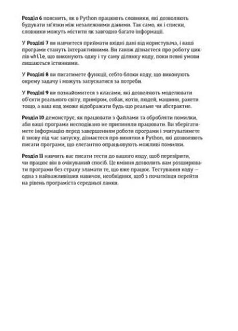 У цій книжці ви розглянете фундаментальні поняття програмування — змінні, списки, класи, цикли та інші, — й навчитеся писати чистий код за допомогою вправ до кожної теми. Ви також дізнаєтеся, як зробити програми інтерактивними та як безпечно тестувати код. А ще ознайомитеся із трьома чималими проєктами, у яких зможете застосувати нові знання на практиці: «Космічні прибульці», гра на кшталт старих аркад; візуалізації даних з використанням спеціальних бібліотек Python; простий вебзастосунок, який можна вивантажити в мережу.