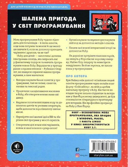 Ви готові освоїти нову мову програмування? Проста у вивченні, цікава у використанні мова програмування Ruby ідеально підходить для початківців. У цій книжці Ruby запрошує вас у фантастичну подорож разом із веселими героями і справжніми чарівниками. Вирушайте у фантастичні пригоди разом з Рубеном і Скарлет, й здобудете практичні навики у програмуванні, а саме навчитеся: використовувати базові поняття у програмуванні, такі як змінні, символи, масиви та текстові рядки; працювати з асоціативними масивами в Ruby, аби створити власне меню сніданку; керувати потоком виконання коду за допомогою циклів та умовних операторів, щоби допомогти королівському сантехнікові; перевіряти свої шалені ідеї в IRB та зберігати свої програми у якості скриптів.