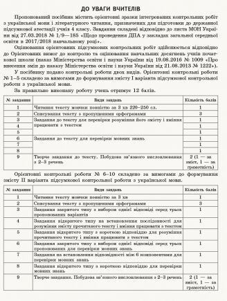 Пропоновані завдання охоплюють усі теми, що вивчає четвертокласник протягом навчального року, і спрямовані на перевірку мовних знань та рівня сформованості умінь і навичок з літературного читання.