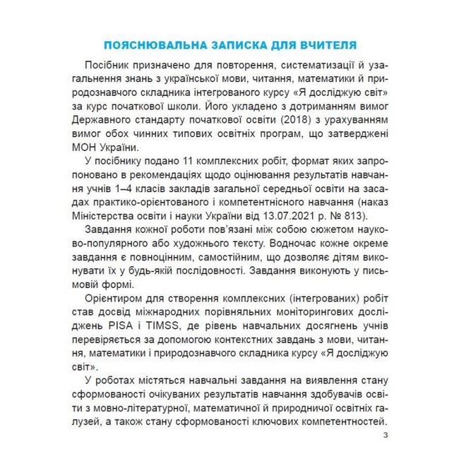 Комплексні роботи укладено з дотриманням вимог Держстандарту початкової освіти (2018) з урахуванням обох чинних типових освітніх програм, що затверджені МОН України. Орієнтиром для створення комплексних (інтегрованих) робіт став досвід міжнародних порівняльних моніторингових досліджень PISA і TIMSS, де рівень навчальних досягнень учнів перевіряється за допомогою контекстних завдань.