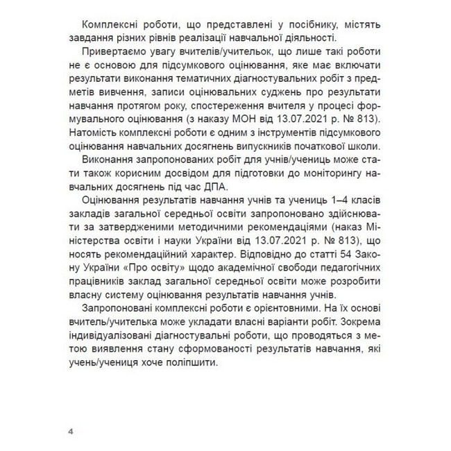 Запропоновано 11 комплексних робіт, формат яких відповідає рекомендаціям щодо оцінювання результатів навчання учнів 1–4 класів закладів загальної середньої освіти на засадах практико орієнтованого і компетентнісного навчання. Завдання кожної роботи пов’язані між собою сюжетом науково-популярного або художнього тексту. Водночас кожне завдання є повноцінним, самостійним, тому їх можна виконувати в будь-якій послідовності.