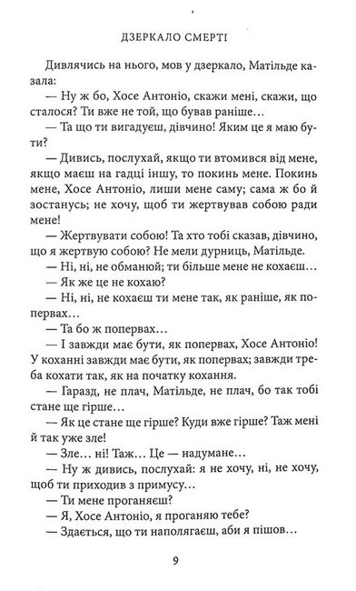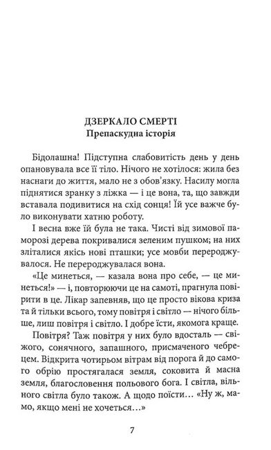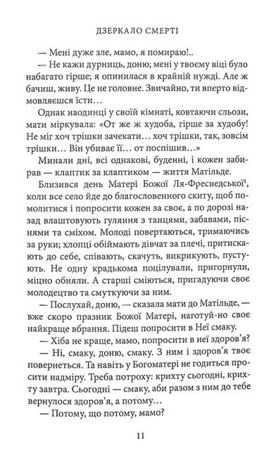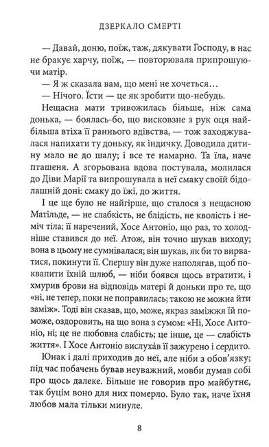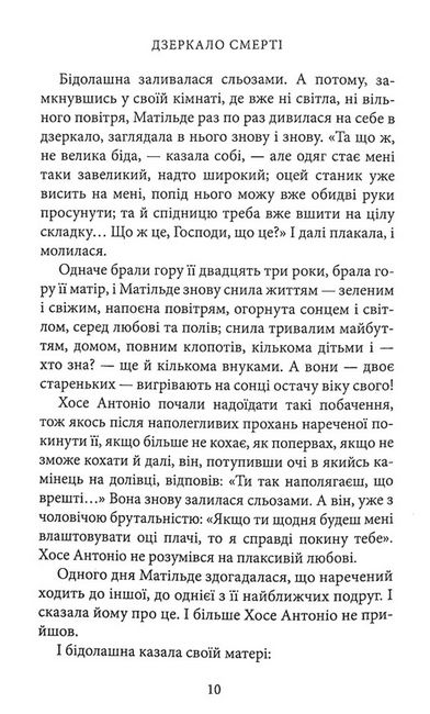 «Дзеркало смерті» — це 27 коротких історій, які були публіковані впродовж двох десятиліть у різних газетах і журналах і які Міґель де Унамуно сам підготував до видання під однією обкладинкою 1913 року. Одні мовби продовжують, розширюють і доповнюють сюжетні лінії, філософські міркування та психологічні портрети з інших текстових полотен письменника, другі ж дивують несподіваною тематикою чи кутом зору. Це історії про життя і смерть, відображені одне в одному, а отже — про дійсність і потойбіччя, сентиментальність і іронію, про дітей і тих, хто на схилі віку, про любов у її різних проявах. Але є тут і розмірковування інтелектуала про політику, про суспільство і врешті про таїнство творчості. Це чи не найцікавіший путівник по неповторних oбразах та ідеях великого іспанського письменника і філософа.