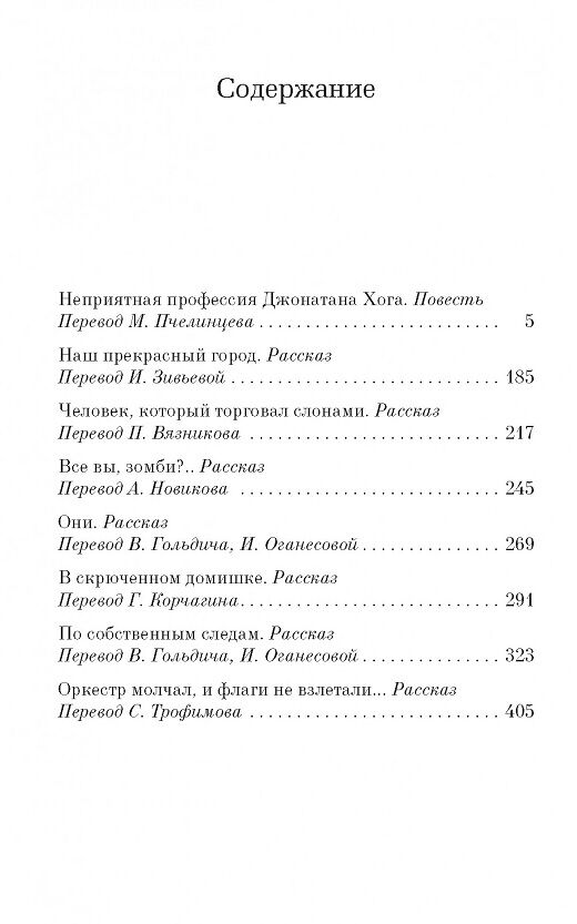 В данном сборнике Роберт Хайнлайн играет на территории знаменитого фантазера Рэя Брэдбери – играет и выигрывает! Тут вы найдете самые разные и самые необычные истории. Это полудетектив-полуфантазия «Неприятная профессия Джонатана Хога» — повесть об иллюзорности мира, который нас окружает. Рассказ «Наш прекрасный город» повествует о дружбе человека и странного существа, живущего на городских улицах. В книге есть рассказы о потерянной и возвращенной любви («Человек, который торговал слонами») и о доме, каждая дверь в котором ведет в непривычные для тебя места («В скрюченном домишке»). И о том, как вернуть себя, распавшегося на множество двойников («Все вы, зомби?..»). А еще о том… Впрочем, откройте книгу и всё узнаете сами.