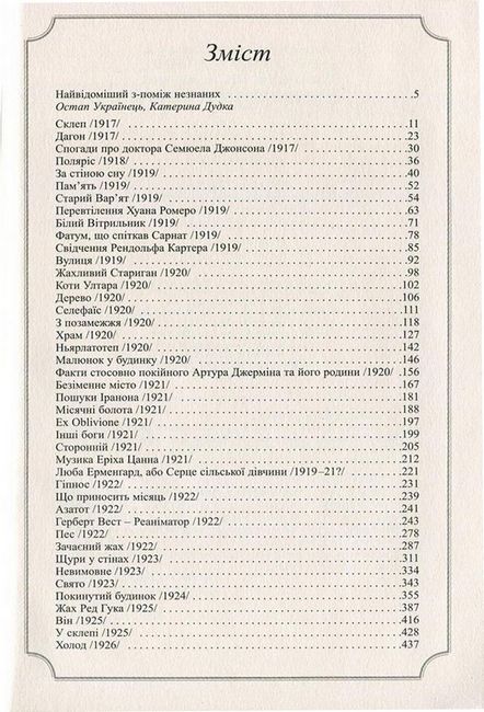 Перший том повного зібрання прозових творів видатного майстра літератури "загадкового та потойбічного" Г.Ф. Лавкрафта охоплює його прозу, написану у період з 1917 по 1926 роки, — від найперших спроб письменника на ниві містичного оповідання "Склеп" і аж до таких відомих творів, як "Храм", "Герберт Вест — Реаніматор", "Зачаєний жах", "Щури у стінах", "Покинутий будинок" та "Жах Ред Гука".