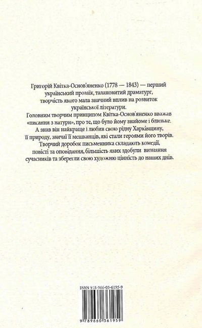 Творчість Григорія Квітки-Основ’яненка (1778—1843) посідає особливе місце в історії української літератури. Саме йому українська література завдячує багатьма своїми рисами. Характер і душа українського народу, жива мова, чудове знання народних звичаїв — все це притаманне творам Квітки-Основ’яненка. До книжки ввійшли твори «Маруся», «Конотопська відьма», «Підбрехач».