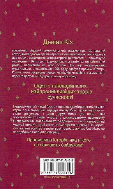 Всесвітній бестселер, який сколихнув серця мільйонів читачів! Неодноразово екранізований роман, який здобув найпрестижніші літературні премії! Історія, яка зворушує та змушує замислитися... Розумово відсталий Гордон погоджується на ризикований науковий експеримент - понад усе він мріє стати розумним. Після надскладної операції на мозку його інтелект дійсно стає блискавичним. Але ніхто не міг передбачити, які наслідки спричинить цей дослід...
