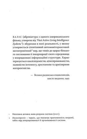 Усе почалося з блискучого спалаху рожевого світла, із зустрічі з таємничою божественною сутністю, яка отримала ім’я Валіс. Чим є ця сутність? Благодатним милостивим Богом, який приходить на допомогу людству, замкненому в тісних стінах Чорної Залізної В’язниці, чи божевільним божеством, яке безжально знищує своє творіння? Або ж, можливо, усе це просто виплід хворої свідомості головного героя із чудернацьким ім’ям Конолюб-Товстун? Найвідоміший із пізніх романів Філіпа К. Діка (1928—1982) «Валіс» (1981), що є своєрідною сумішшю наукової фантастики й теологічного детективу, де Богу відведена роль водночас і розшукуваної особи, і верховного лиходія, занурює читача у класичний «філіпдіківський» світ, що є заразом приголомшливо захопливим, бентежним і моторошно смішним.