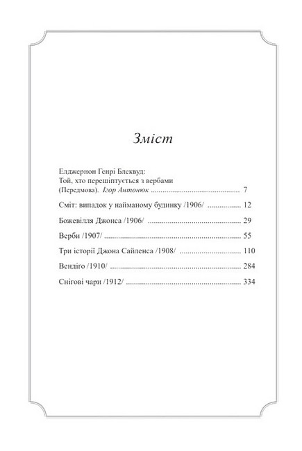 До вибраних творів Елджернона Блеквуда увійшли одні з найвідоміших його оповідань, а саме: «Верби», «Вендиґо» та «Снігові чари», де автор із притаманним йому хистом змальовує зіткнення повсякденності та незвіданих прадавніх сил природи; «Сміт: випадок у найманому будинку», де йдеться про прадавню магію, здатну прикликати до нашого світу несьогосвітні сутності; «Божевілля Джонса», в якому Блеквуд оповідає про тяглість пам’яті та природу людської душі, а також декілька історій з циклу, присвяченого практиці доктора Джона Сайленса, своєрідного «окультного детектива», який завдяки своїм силам і знанням допомагає людям, що опинились у скрутних і незбагненних ситуаціях.