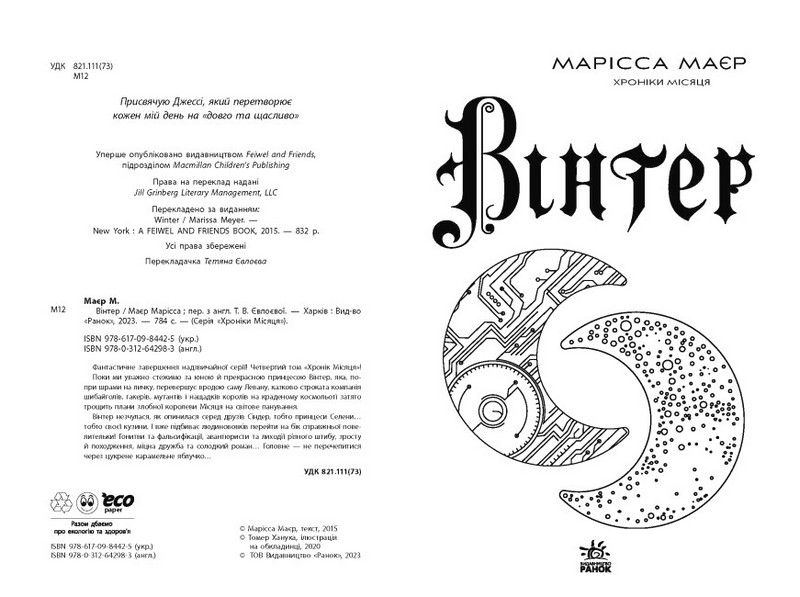 Вінтер — справжня місячанка й справжня принцеса. Як усі місячани, вона має дар впливати на свідомість, але радше помре, ніж скористається ним. Бо ж її гарненька голівка забита геть іншим. Не хитромудрі інтриги, не жага світового панування гріють ніжне серденько дівчини. Принцеса не прагне того, що пожирає розум і серце її мачухи, королеви Левани. Так само огидний їй і Емері Парк, верховний тавматург та улюблений посіпака королеви, який мріє взяти Вінтер за дружину. Принцеса любить арктичного білого вовка Рю, а ще просто марить гвардійцем Джейсіном, своїм вартовим. Однак раптом світ дівчини розбиває на друзки найдивакуватіша компанія на краденому космольоті: Сіндер, або принцеса Селена, та її строкатий почет перевертають життя Вінтер. Вони готові на все, щоб здолати її мачуху: від палких приголомшливих викриттів у залі суду до штурму королівського палацу з армією людинововків. І Вінтер! Вона теж готова… але оця її слабкість до цукрених карамельних яблучок.