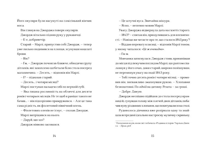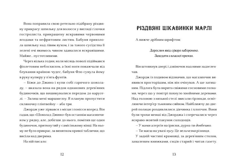Однак різдвяна магія сильніша за будь-яких буркотунів, вона може прослизнути у двері, з’явитися у вікні, змінити призначення мідного дверного стукальця або взяти хлопчика за руку — і потягнути у захопливу та чарівну подорож!