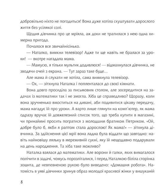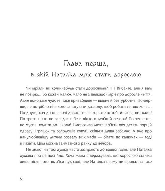 Хочеш стати дорослою людиною просто зараз? Та будь ласка! Королева Хаосу це миттю організує! Іншим дітям треба до школи ходити, а їй, дорослій Наталці, — лише розважайся! Щоправда, невдовзі з’ясувалося, що доросле життя — не мед. Десь треба брати гроші, які швидко закінчуються, та ще й приглядати за молодшим братиком Петриком… Вона й гадки не мала, що дорослі мають цілу купу обов’язків…