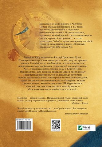 Джессіка Таунсенд — австралійська письменниця. Працювала копірайтеркою та контент-менеджеркою в галузі туризму та нерухомості, а також редакторкою Crikey! — чудового журналу для дітей. Дебютна книжка авторки «Невермур. Випробування Морріґан Кроу» є лауреатом восьми премій і бестселером за версіями The New York Times, Nielsen Bookscan UK, IndieBound, наступну частину — «Дивосміт. Покликання Морріґан Кроу» — визнано найкращою книжкою року за версією Irish Independent.