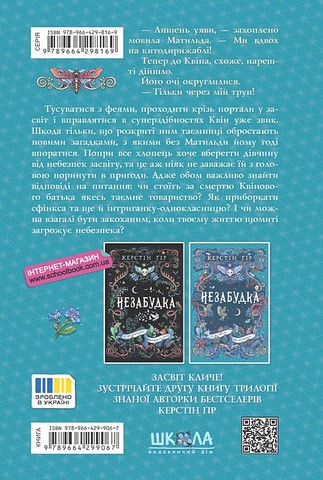 У другій книжці серії «Незабудка» пригоди Квіна й Матильди в потойбіччі тривають.Проходити крізь портали у засвіт і вправлятися в суперздібностях хлопець уже звик. Шкода тільки, що розкриті ним таємниці обростають новими загадками, з якими без Матильди йому годі впоратися. Попри все він хоче вберегти дівчину від небезпек засвіту, та це аж ніяк не заважає їй з головою поринути в пригоди. Адже обом важливо знайти відповіді на питання: чи стоїть за смертю Квінового батька якесь таємне товариство? Як приборкати сфінкса та ще й інтриганку-однокласницю? І чи можна взагалі бути закоханим, коли твоєму життю щомиті загрожує небезпека?