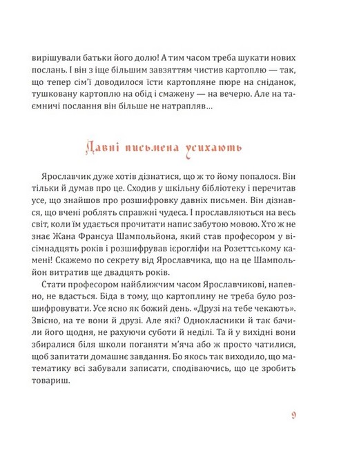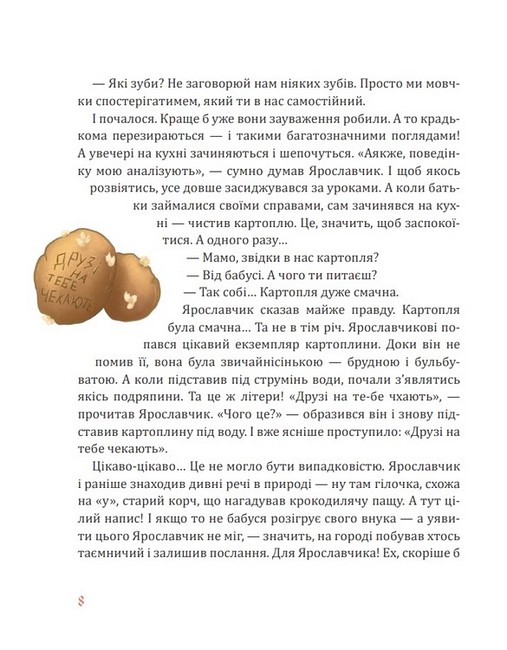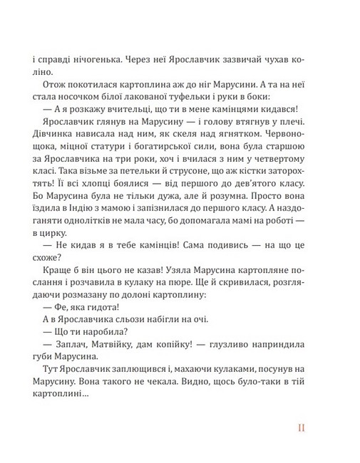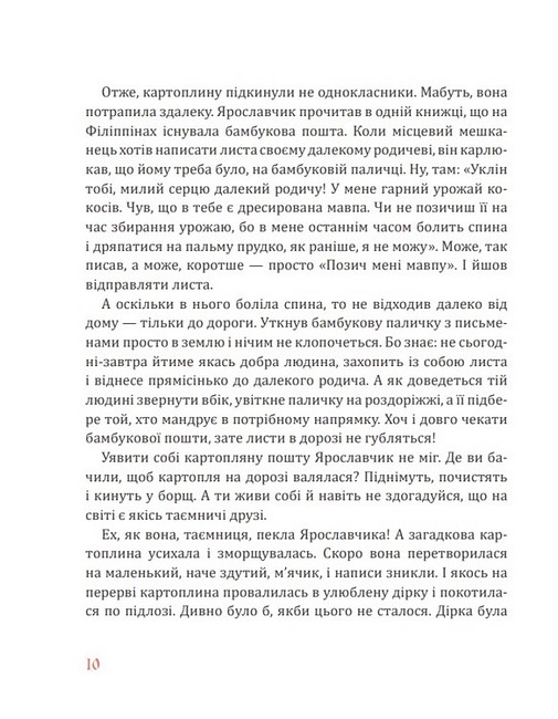 У цій дивовижній книжці можливо все: передавати послання картопляною чи бамбуковою поштою, заховати лева в коров’ячій шкурі, перетворити подушки на людей, отримати серед літа подарунок від Святого Миколая, ба навіть повернути блискавку в хмару і зібрати дрібний мак у маківку. До того ж героїв цієї книжки — доброго Ярославчика і хвацьку Марусину, пані Гримальду й Паця Крутелика, Подушинського й Коку Непереможного, королівну Реготасю й усіх інших — годі сприймати без доброї усмішки, а їхні пригоди нерідко такі карколомні, що аж подих перехоплює! А ще тут чудова українська мова, яка неодмінно зачарує як маленьких читачів, так і їхніх батьків. Воно й не дивно — адже цю книжку склали вибрані повісті й казки відомої дитячої письменниці, а в «дорослому житті» — авторитетної мовознавиці Лесі Мовчун.