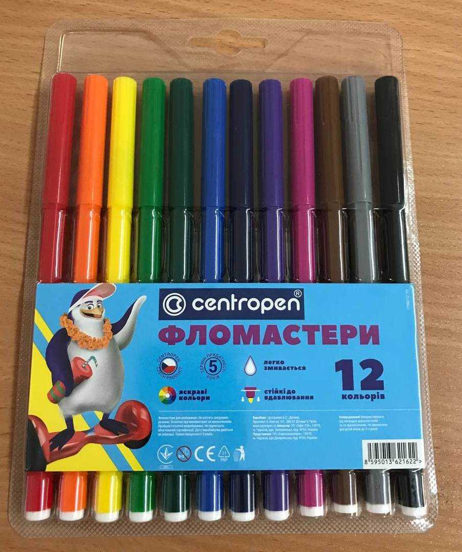 Фломастери 12 кольорiв Centropen. Стійкі до видавлювання, легко змивається, яскраві кольори.