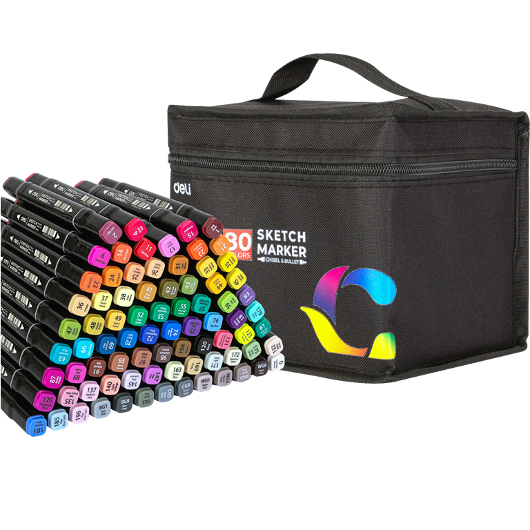 Скетч-маркери Deli 80кол 1мм/7мм двостороннi, квадратний корпус, тканева сумка
