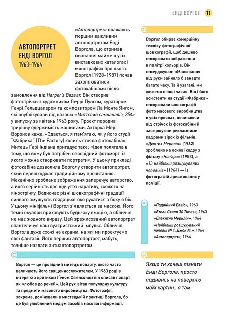 Для чого робити автопортрет, але закривати обличчя лампочкою? Навіщо навмисне недоекспоновувати зображення або фотографувати стелю? І чому це все вважається мистецтвом? У цій книзі Джекі Гіґґінс цікаво та інформативно розповідає про сучасну фотографію. На прикладі 100 ключових фотографів авторка досліджує, що стало натхненням для їхніх робіт, та як саме вони були створені. Джекі Гіґґінс пояснює значення цих унікальних світлин, та чому вони розмиті, переекспоновані або “погано” скомпоновані. Авторка раз і назавжди доводить, що мистецтво фотографії набагато складніше, ніж здається на перший погляд.