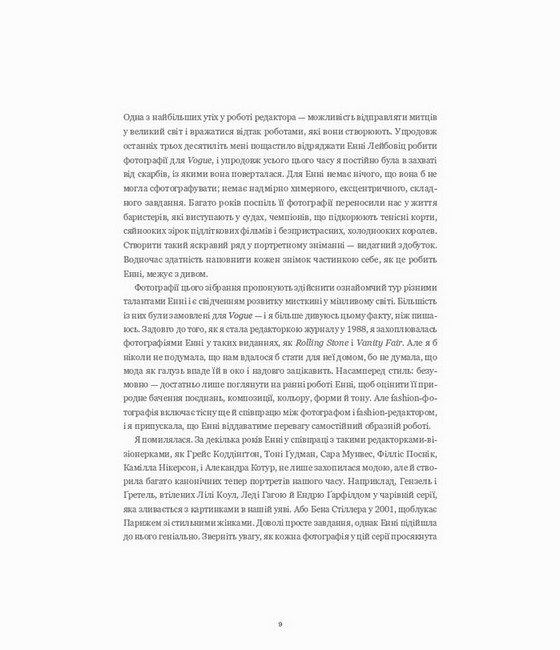 Ця книга — фотоальбом легендарної Енні Лейбовіц, де зібрані її модні фотографії за останні п’ятдесят років. Ви зможете насолодитися 350-ма неймовірними роботами, більшість з яких не публікувалися раніше. У книзі представлені портрети таких видатних особистостей як: Ніколь Кідман, Серени Вільямс, Піни Бауш, РуПола, Леді Гаги, Королеви Єлизавети, Ненсі Пелосі та багатьох інших. А ще тут ви знайдете передмову від Анни Вінтур, коментарі Енні Лейбовіц та її інтерв’ю з Карен Малліґан.
