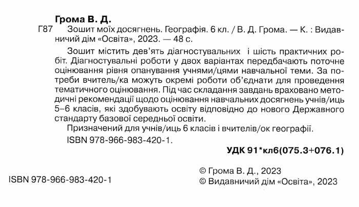 Зошит моїх досягнень Географія 6 клас НУШ Авт: В. Грома Вид-во: Освіта 90718