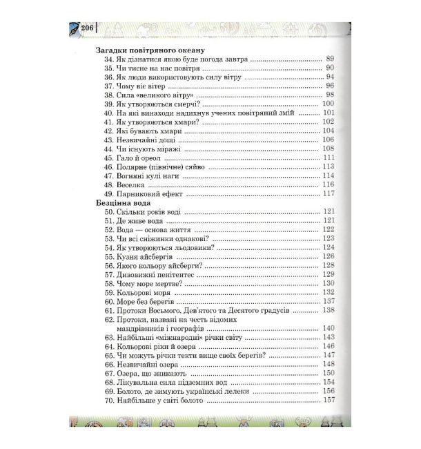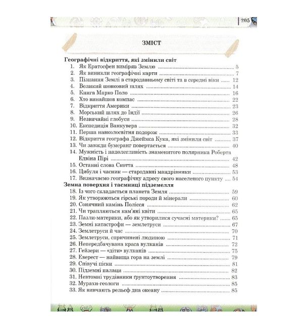 У ньому наведено історії про відкриття різних географічних об’єктів, цікаві факти з різних розділів географії, деякі факти щодо природних явищ із науковим обґрунтуванням, інструкції для виконання експериментів. Він стане в нагоді для урізноманітнення навчального процесу, а також для підготовки до предметних тижнів, географічних свят, конкурсів тощо.