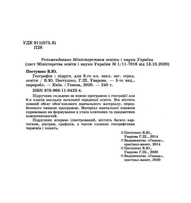 Підручник Географія 6 клас Нова програма Авт: Пестушко В. Уварова Г. Вид-во: Генеза 11906